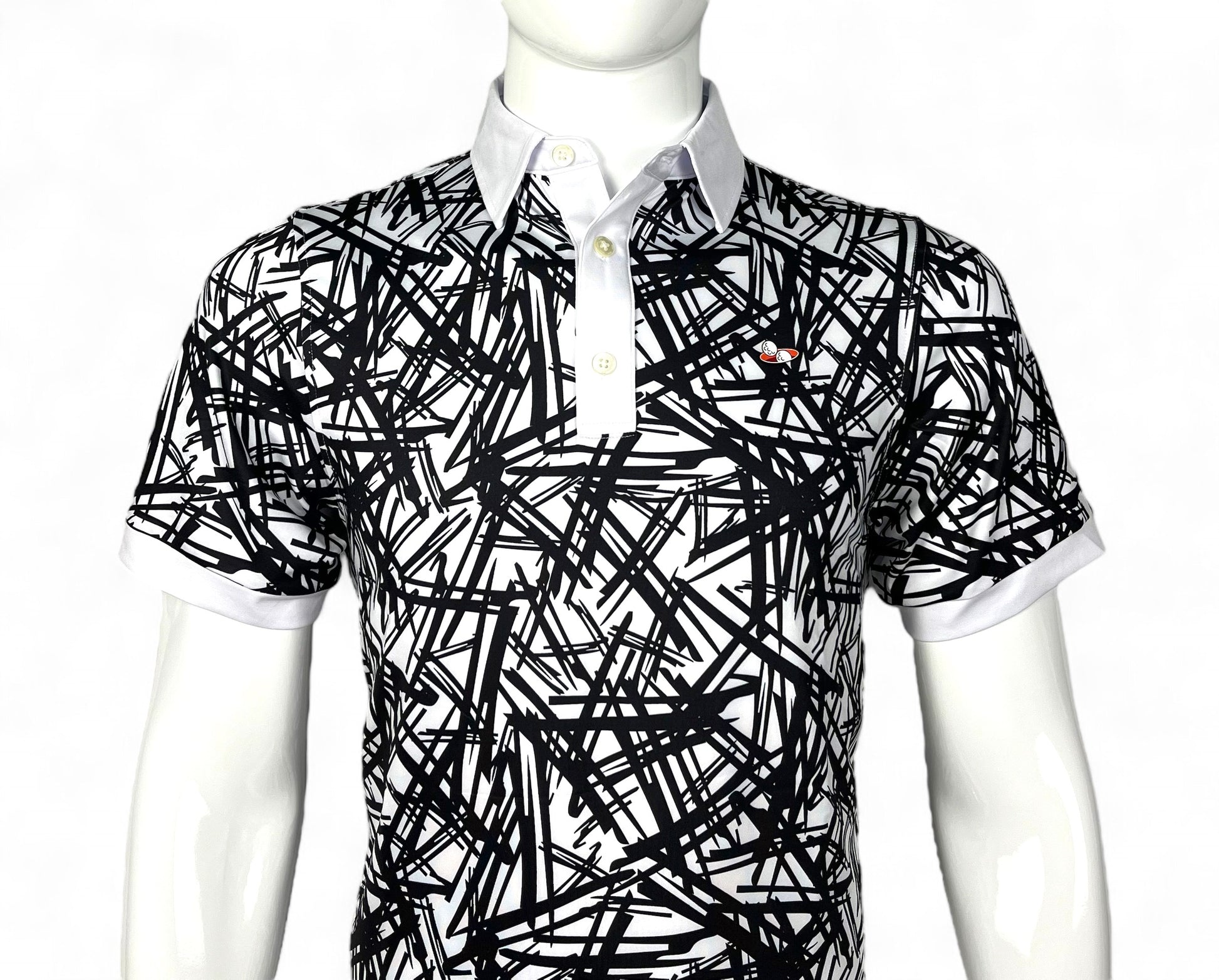 The ABSTRACT W POLO features a dynamic black line pattern set against a clean white background, creating a bold yet minimalist design. The red vinyl logo on the chest offers a sharp contrast, adding a vibrant pop of color. With its sleek look and comfortable fit, this polo is perfect for both on and off the course, offering modern style with a touch of edge.