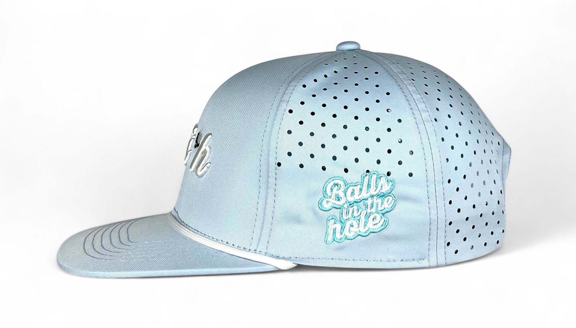 In a soft baby blue hue, this cap features “BITH” in white 3D embroidery on the front, accented by a white golf ball detail. A subtle white rope above the brim adds a touch of sophistication, while the side is embroidered with “Balls in the Hole” lettering in white with a baby blue outline, celebrating the brand’s spirit. Built with breathable, perforated fabric, the BABY BLU Cap is lightweight, waterproof, and even floats, ensuring it performs well in any weather and stays secure.