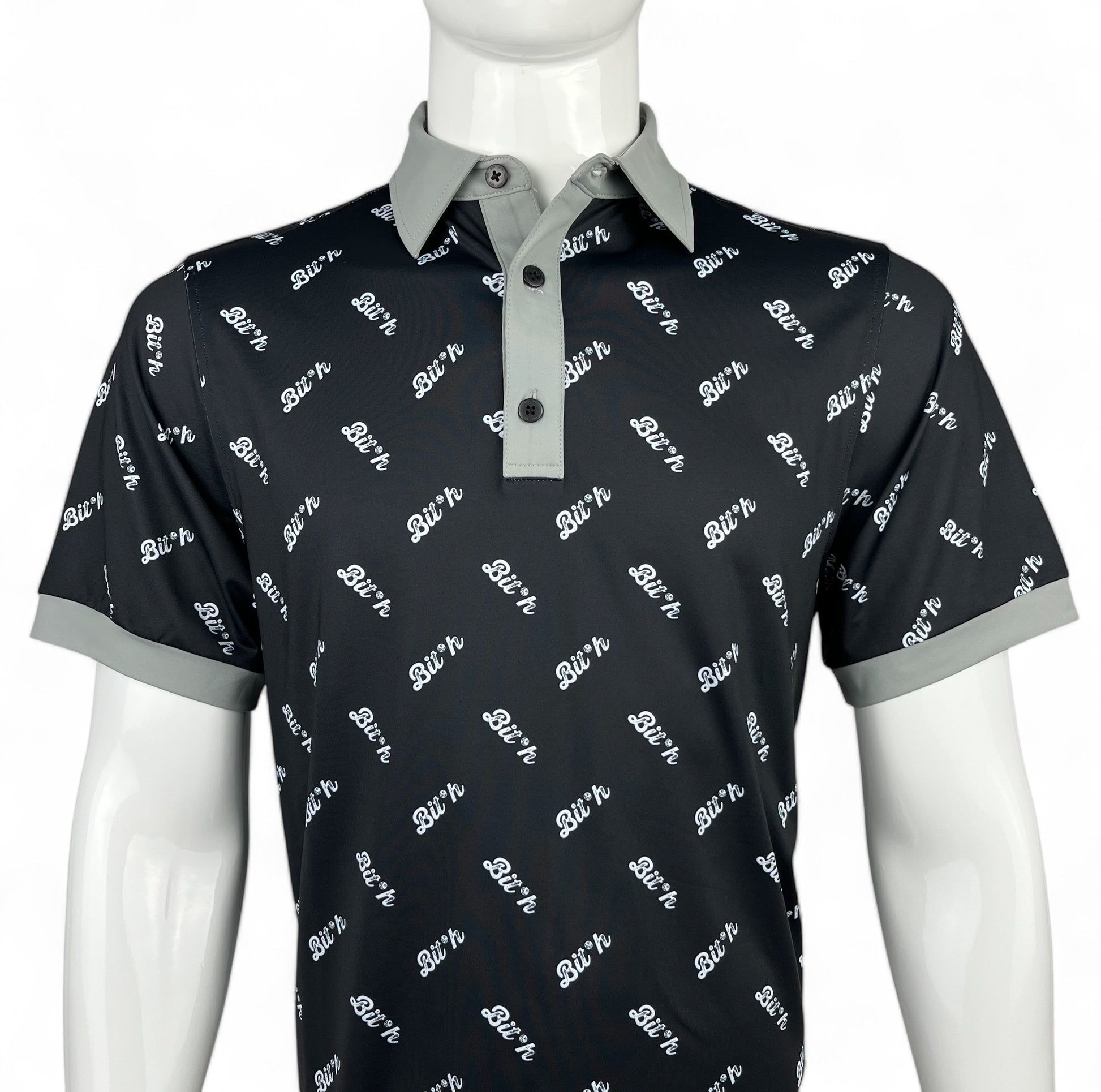 The BITH BLK Golf Polo is a dynamic blend of modern design and timeless elegance. Featuring a sublimated black background with "BITH" repeated in striking white, this polo is as bold as your game. The cement grey accents on the neck and sleeves, paired with sleek black buttons, add a touch of sophistication to this standout piece.