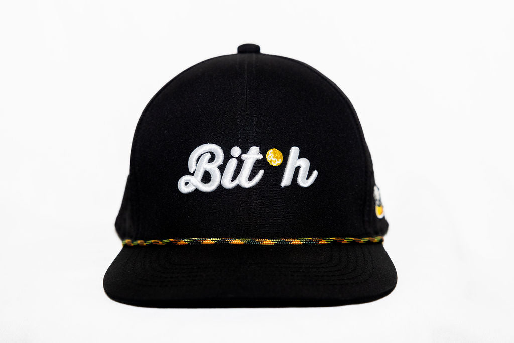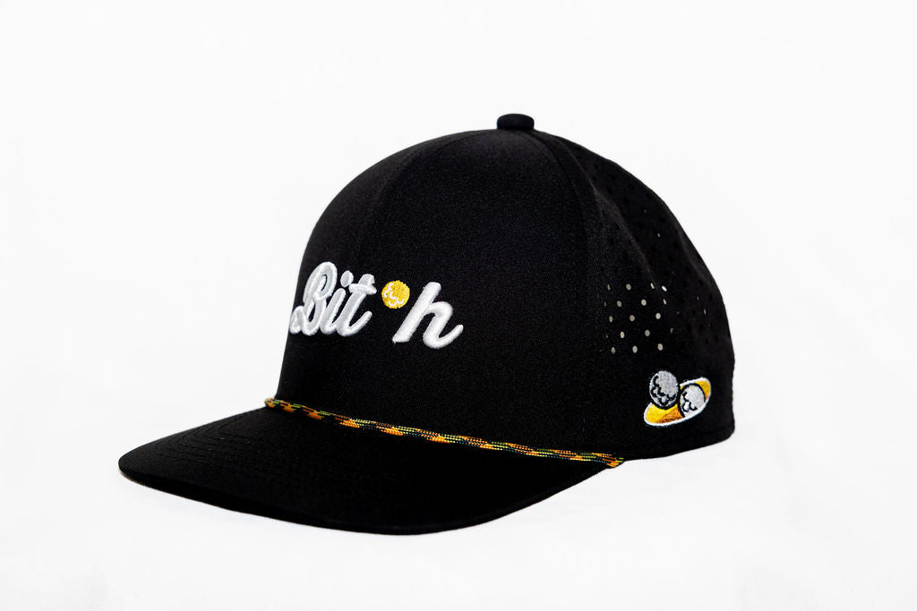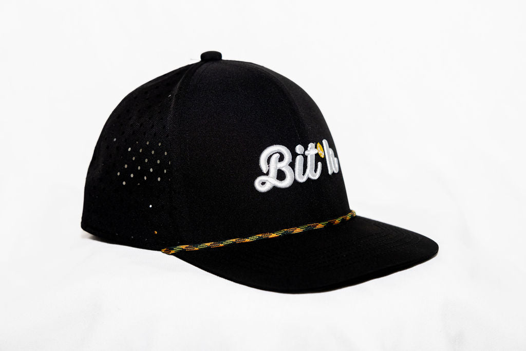 In a sleek black color, this 6-panel cap features a flat brim and a striking “BITH” design on the front. The word is embroidered with precision in clean white 3D stitching, accented by a vibrant yellow golf ball for a distinctive touch. A multicolor rope in black, orange, yellow, and green adds a pop of energy to the design, while the side features our logo in white, yellow, and orange, completing the look with finesse. Built with breathable, perforated fabric, the BLCK Cap is lightweight, waterproof, and even floats, making it a reliable companion in any weather or condition.