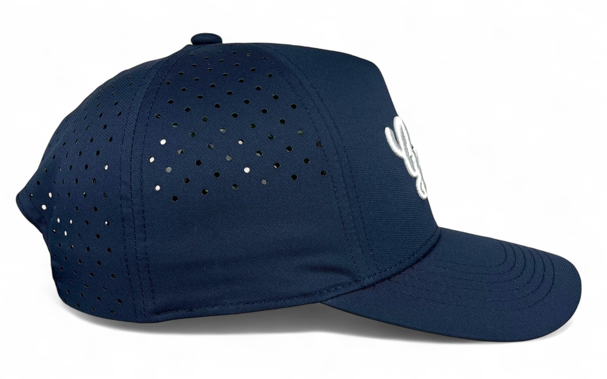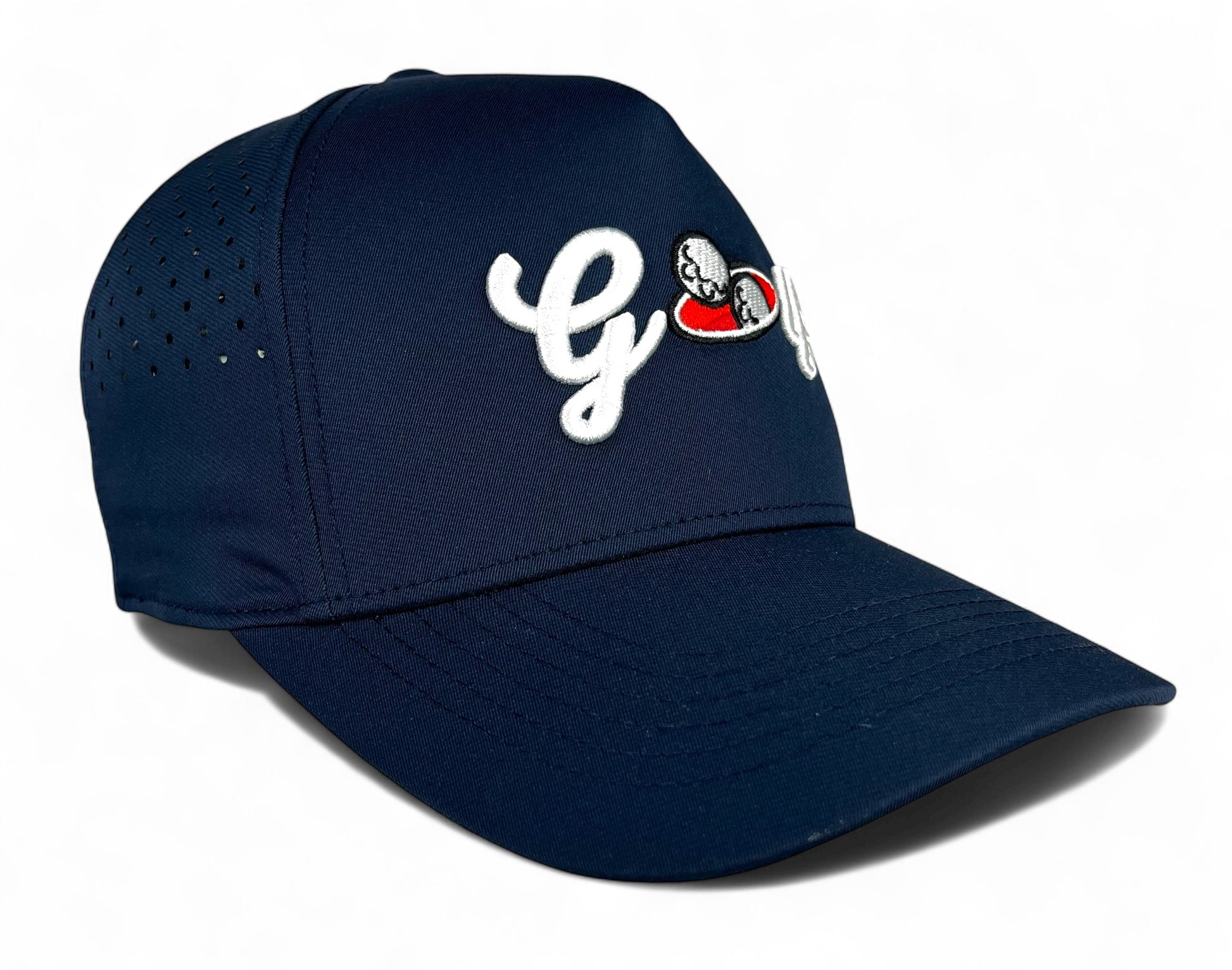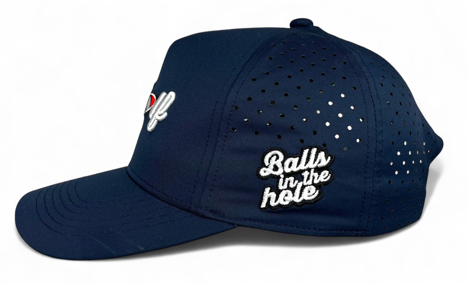 Available in both 5-panel and 6-panel styles, the cap comes in a classic navy color and features a flat brim along with a prominent “GOLF” design on the front. The word is creatively embroidered with a mix of 3D and flat techniques, with our logo ingeniously replacing the “O” for a distinctive touch. The side is adorned with “Balls in the Hole” lettering in white embroidery outlined in black, adding an extra layer of brand detail. Built with breathable, perforated fabric, the GOLF Cap is lightweight, waterproof, and even floats—making it ready for any condition on the course.