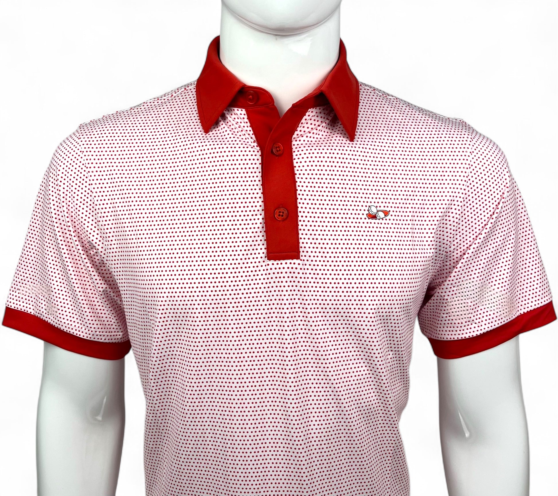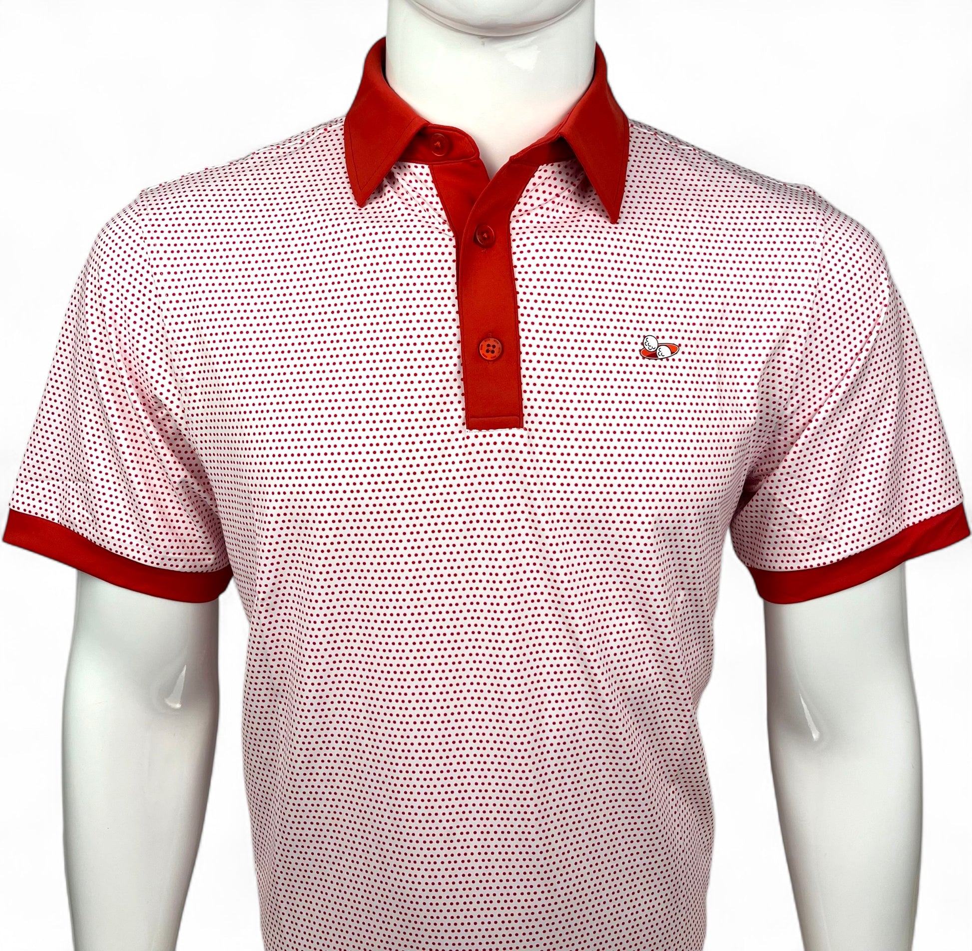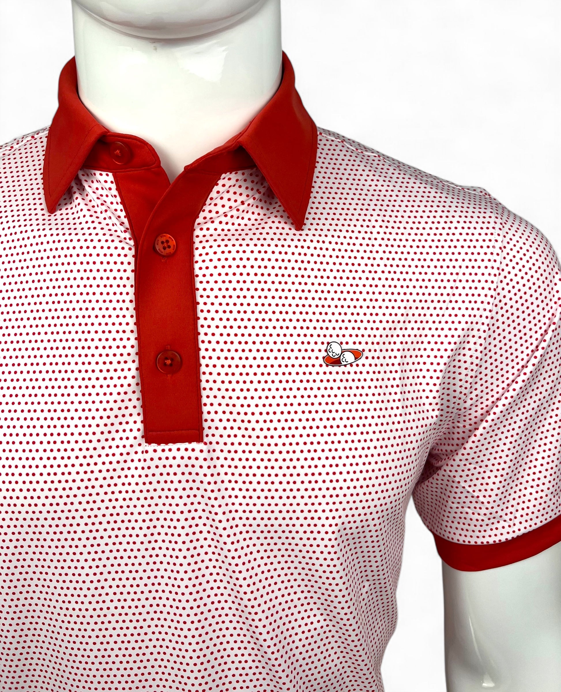 When timeless meets tropical, you get the CORAL DOTS. This men’s golf polo brings a clean white base to life with a full spread of coral-colored dots, giving you a fresh take on classic prints. With a matching solid coral collar, placket, and buttons, plus our signature red vinyl logo on the chest, this piece brings the right balance of subtle and standout.