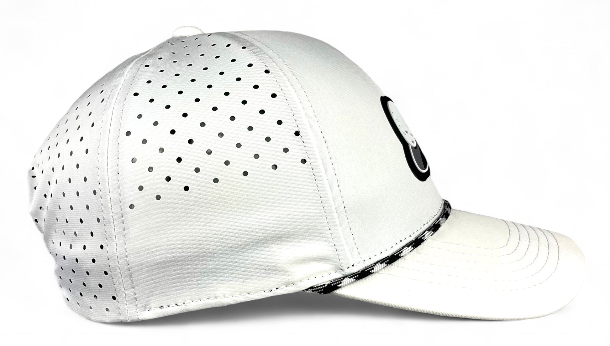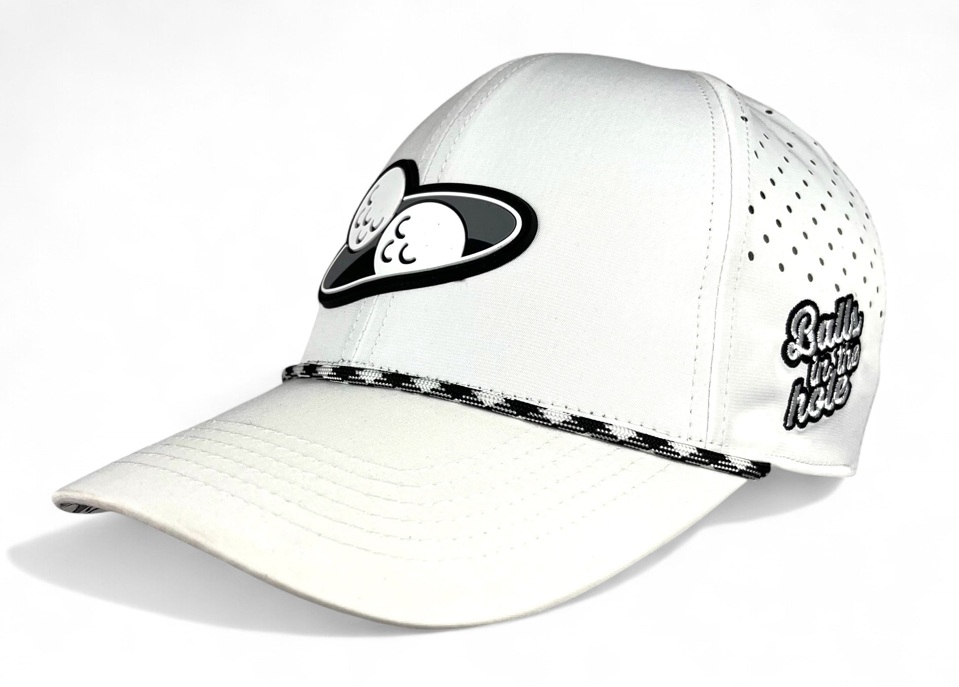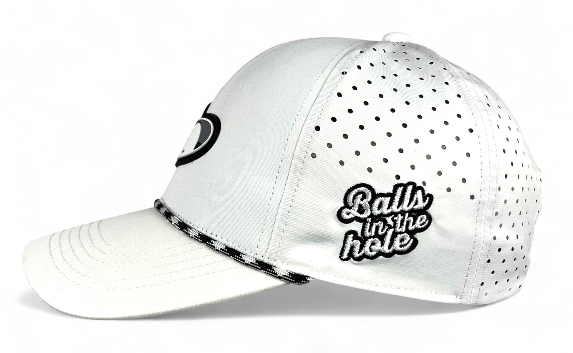 In a crisp white color, this 6-panel, baseball-style cap features a curved brim and a striking rubber patch logo on the front in white, black, and grey. A black-and-white patterned rope above the brim adds a stylish touch, while “Balls in the Hole” is embroidered on the side in white with a black outline, showcasing the brand’s signature detail. Under the brim, a sublimation of the logo in white, black, and grey is repeated for a subtle yet refined finish. Crafted with perforated fabric, the LA W Cap is lightweight, waterproof, and floats, offering superior performance in any weather conditions.