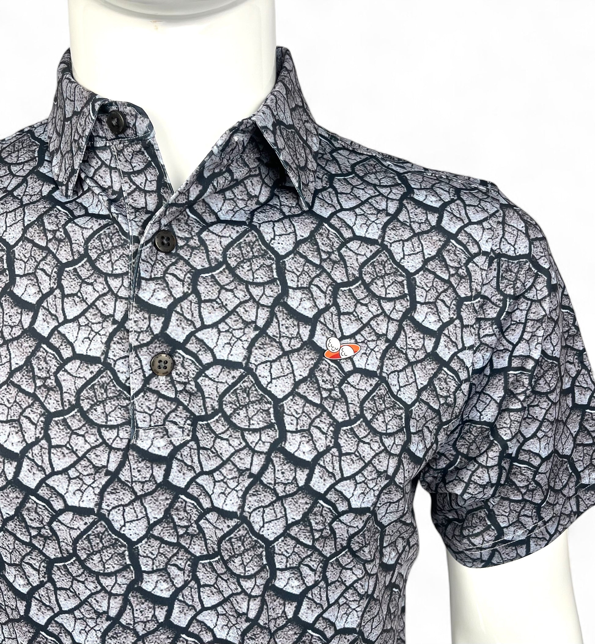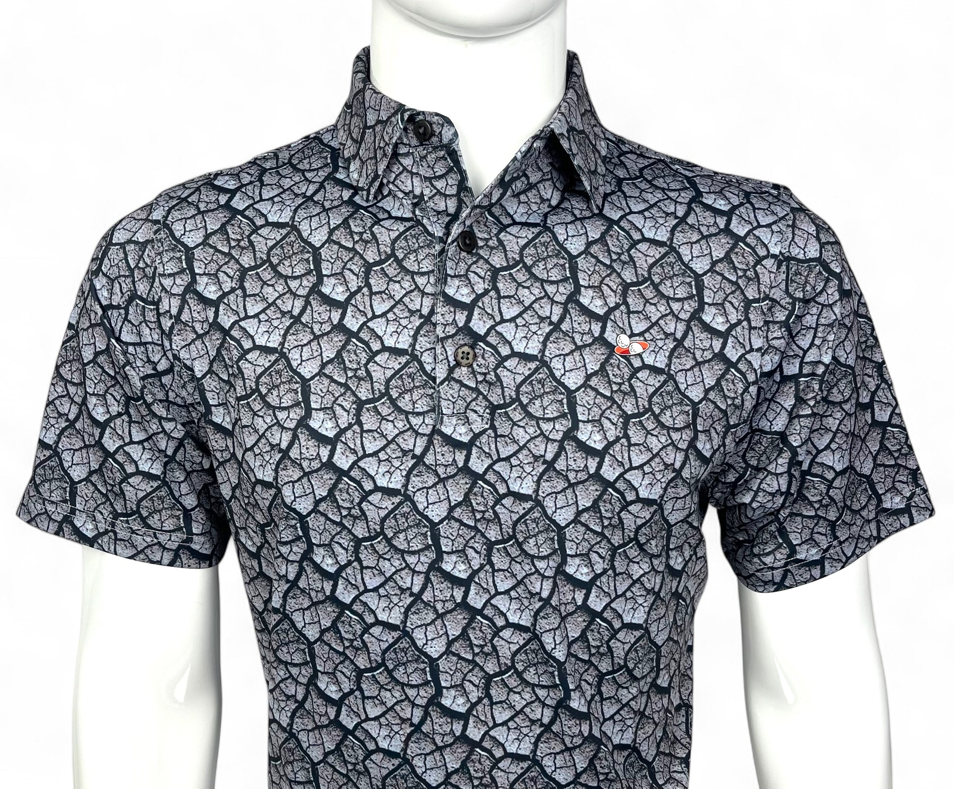 The LUNA Polo takes your style to another dimension—literally. Inspired by the surface of the Moon, this design features a sublimated cracked-soil pattern in rich grey and black tones. With matching sublimation on the collar and sleeves, sleek black buttons, and our signature red vinyl logo on the chest, it’s the perfect blend of cosmic cool and performance-ready function.