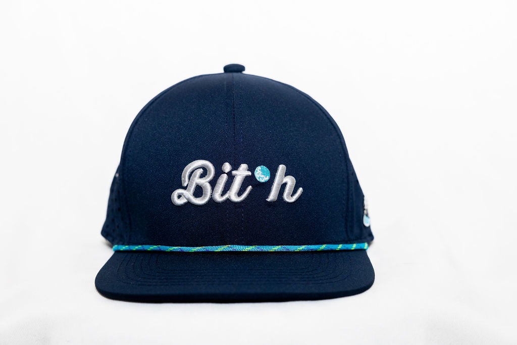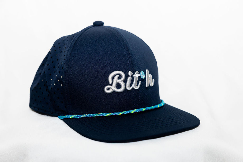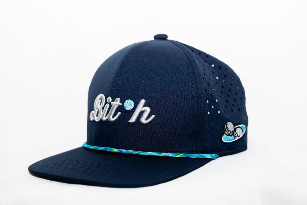 In a classic navy hue, this 6-panel cap features a flat brim and “BITH” embroidered in stunning platinum grey 3D stitching, complemented by a vibrant blue golf ball for an eye-catching finish. The front rope, featuring graphic colors in blue, yellow, and navy, adds an energetic touch, while the side displays our logo in white and blue for a polished and cohesive design. Made with breathable, perforated fabric, the NVY Cap is lightweight, waterproof, and floats – perfect for any weather or condition on the course.